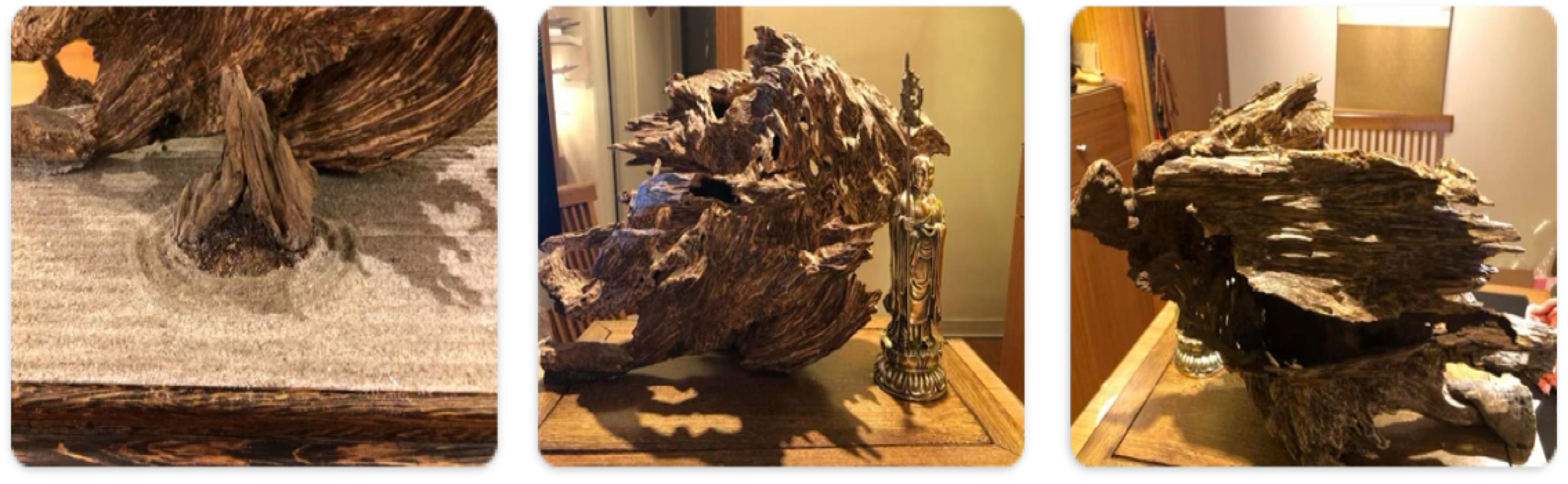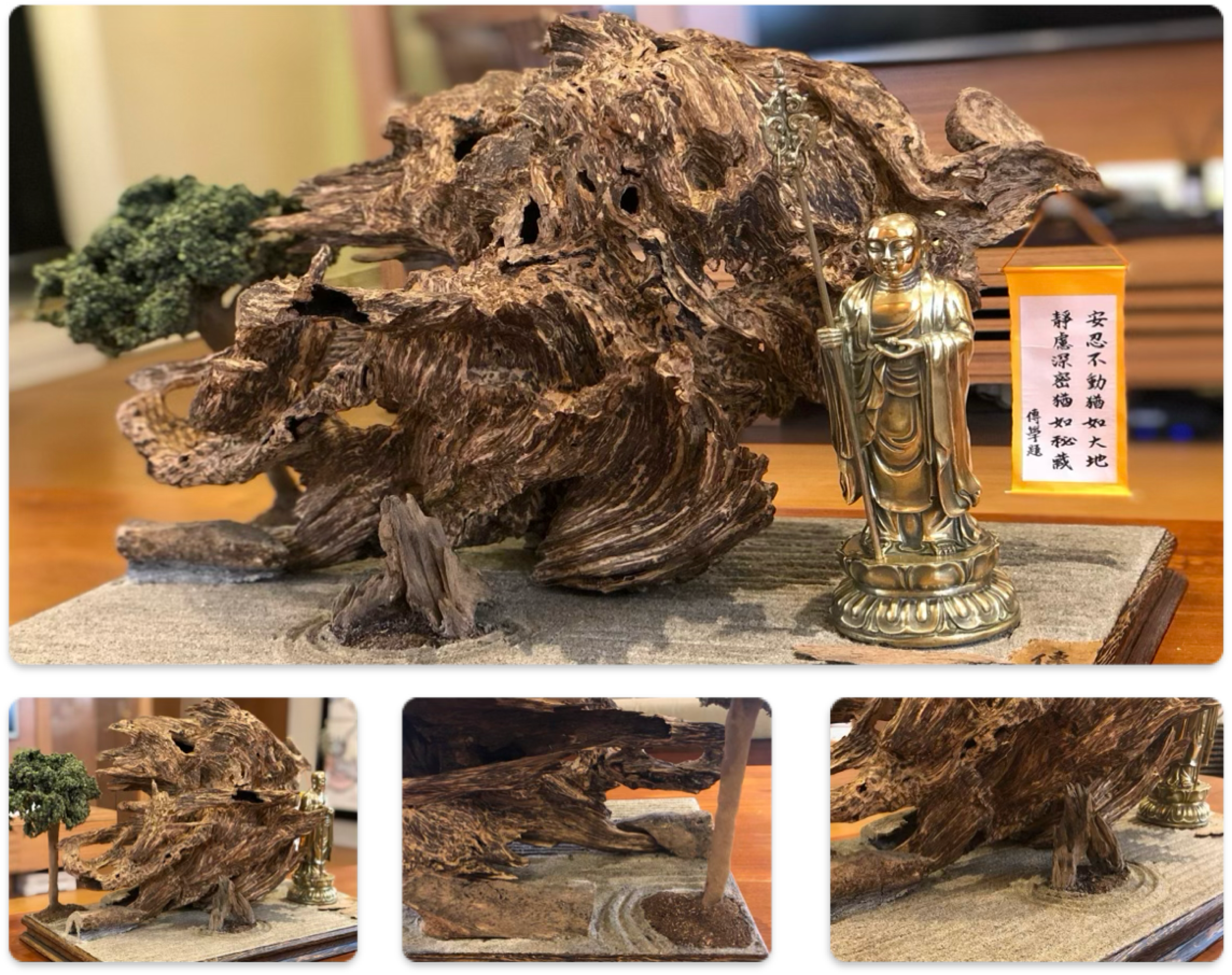 在整理這塊香時,内部有殘留下許多乾酒的黑土,當中有許多其他植物的根已經長滿這塊香的内部,清出的黑土不少,有些黑土就當成這作品中樹木的土壤,整件作品用的是日本枯山水的造境特色,而枯山水是不引水入園、純粹以白色砂石表現水、石頭表現山,使這件沉香充滿了式禪意的感覺,這件用的白砂,是筆者印度朝聖時,從恆河請回的,對於比較深入了解佛教的人,就都稱此沙為金光明砂。